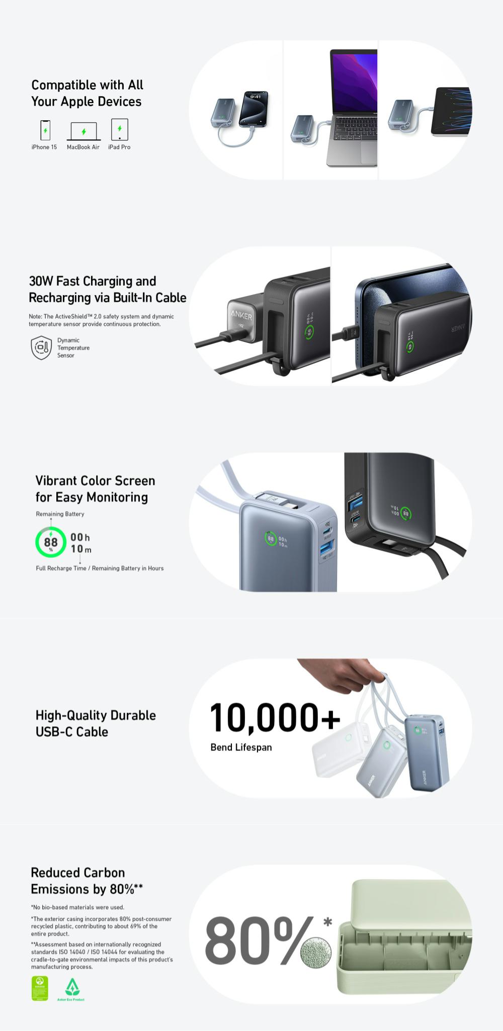 Power Bank Anker Nano (30 W, cablu USB-C integrat), manual de instructiuni (limba engleza nu este garantata).