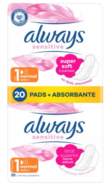 Aceste absorbante prezinta un strat superior Soft Like Cotton si zone de confort unice pentru a asigura un confort sporit pentru pielea dumneavoastra delicata. Ideale pentru zilele cu scurgeri normale ale ciclului menstrual. Cu aripioare ce confera o protectie laterala sporita si ajuta la fixarea absorbantului. Absorbantele igienice cu aripioare Always Ultra Sensitive Normal (Marimea 1) sunt cele mai bune absorbante igienice de la Always Sensitive pentru zilele cu scurgeri mici si medii. Interior absorbant Super Ultra cu gel care impiedica scurgerea lichidului. Nucleu Fit&Flex ce va urmeaza miscarile si tehnologia OdourLock cu un parfum incantator pentru a neutraliza mirosurile neplacute (Fara 26 alergeni UE). incercati absorbantele de zi pentru confort si protectie pe parcursul zilei si absorbantele de noapte pentru un somn linistit. incercati marimea 5 pentru o protectie mai buna pe timpul noptii.