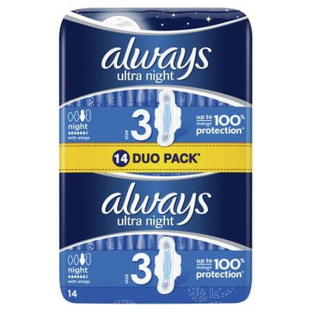 Recomandate pentru utilizare atat pe timp de zi, cat si pe timp de noapte, absorbantele Always Ultra Night (Marimea 3) cu aripioare ofera protectie de pana la 100% pentru forma si fluxul tau unice. Ideale pentru scurgeri moderate, cu chilot de marimea L sau pentru scurgeri abundente cu chilot de marimea M sau L.