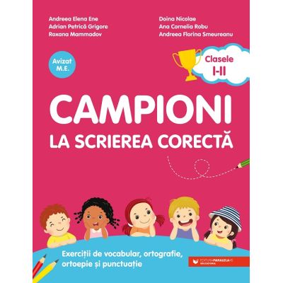 Campioni la scrierea corecta clasele I-II exercitii de vocabular ortografie ortoepie si punctuatie este o lucrare conceputa sub forma unui caiet care se adreseaza elevilor din clasele primare I-II ce vor sa-si fixeze cunostintele dobandite la clasa. Caietul este structurat in trei parti fonetica si vocabular sunetul litera silaba cuvantul despartirea in silabe sinonime antonime omonime propozitia ortografie scrierea cu x i a m inainte de b si grupuri de vocale grupuri de litere ortograme si punctuatie punctul semnul intrebarii semnul exclamarii linia de dialog virgula doua puncte . Exercitiile propuse sunt variate si ingenios realizate de autori pentru a-i atrage pe cei mici. Fiecare capitol este insotit de fise de recapitulare si de evaluare.Specificatii