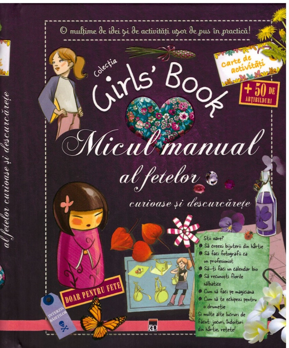 Acest manual contine aproximativ 60 de subiecte pentru fetele curioase, care sunt pasionate de lucrul manual si de jocurile in aer liber. Lucrarea alterneaza textele explicative cu activitatile practice. Numeroase ilustratii si multe note confera acestei carti si o latura didactica. Volumul reprezinta o sursa de idei usor de pus in practica de catre fete (prepararea unor deserturi, fabricarea bijuteriilor de hartie, decriptarea mesajelor secrete, impodobirea unei mese, realizarea unui calendar si altele).Specificatii