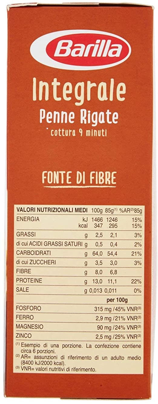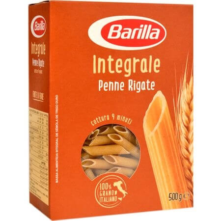 Pastele integrale Barilla vor adauga meselor tale gustul fibrelor care te face sa te simti bine! O portie de paste Barilla Integrale (85 g) aduce un aport de fibre de peste 20% din cantitatea recomandata zilnic. Inconfundabila culoare aurie este rezultatul unei metode exclusive folosite in morile Barilla, iar consistenta lor este studiata pana in cele mai mici detalii pentru a oferi calitate maxima, intodeauna al dente. Penne Rigate Integrale de la Barilla, avand un diametru redus si fiind sursa naturala de fibre, se remarca prin modul in care retin condimentele. Gratie dimensiunilor reduse, se amesteca perfect cu sosul, in timp ce in canelurile exterioare se strang diverse ingrediente pentru eliberarea de arome surprinzatoare.