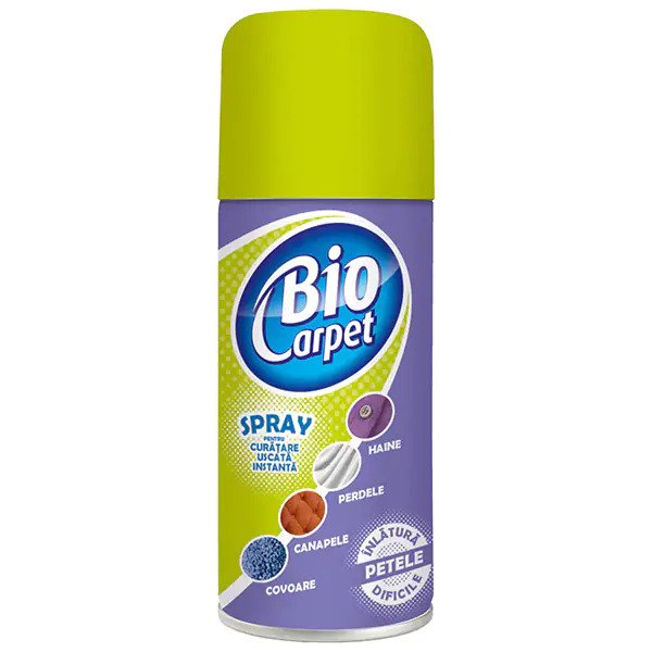 Biocarpet spray pentru curatare uscata, instanta. Indeparteaza eficient petele dificile, fara ajutorul apei. Ideal pentru covoare, canapele, tapiterii, perdele, fete de masa, haine, tesaturi care necesita curatare uscata. Nu este recomandat pentru indepartarea petelor de vopsea si a celor care necesita inmuiere/dizolvare in apa. A nu se folosi pe materiale impermeabile sau materiale din piele. Este ideal pentru calatorii, restaurant, la birou sau in masina.