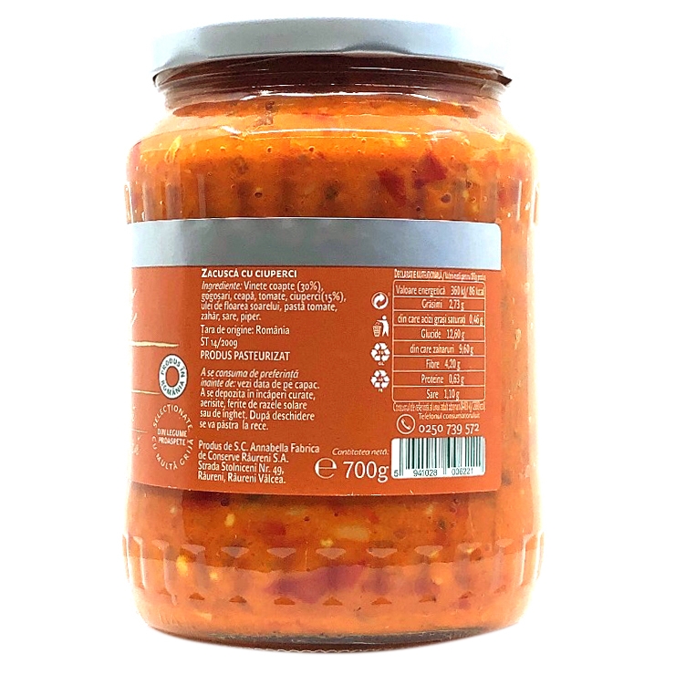 Ingrediente: Vinete coapte, gogoşari, ceapă, tomate, ciuperci, ulei de floarea soarelui, pastă de tomate, zahăr, sare, piper.