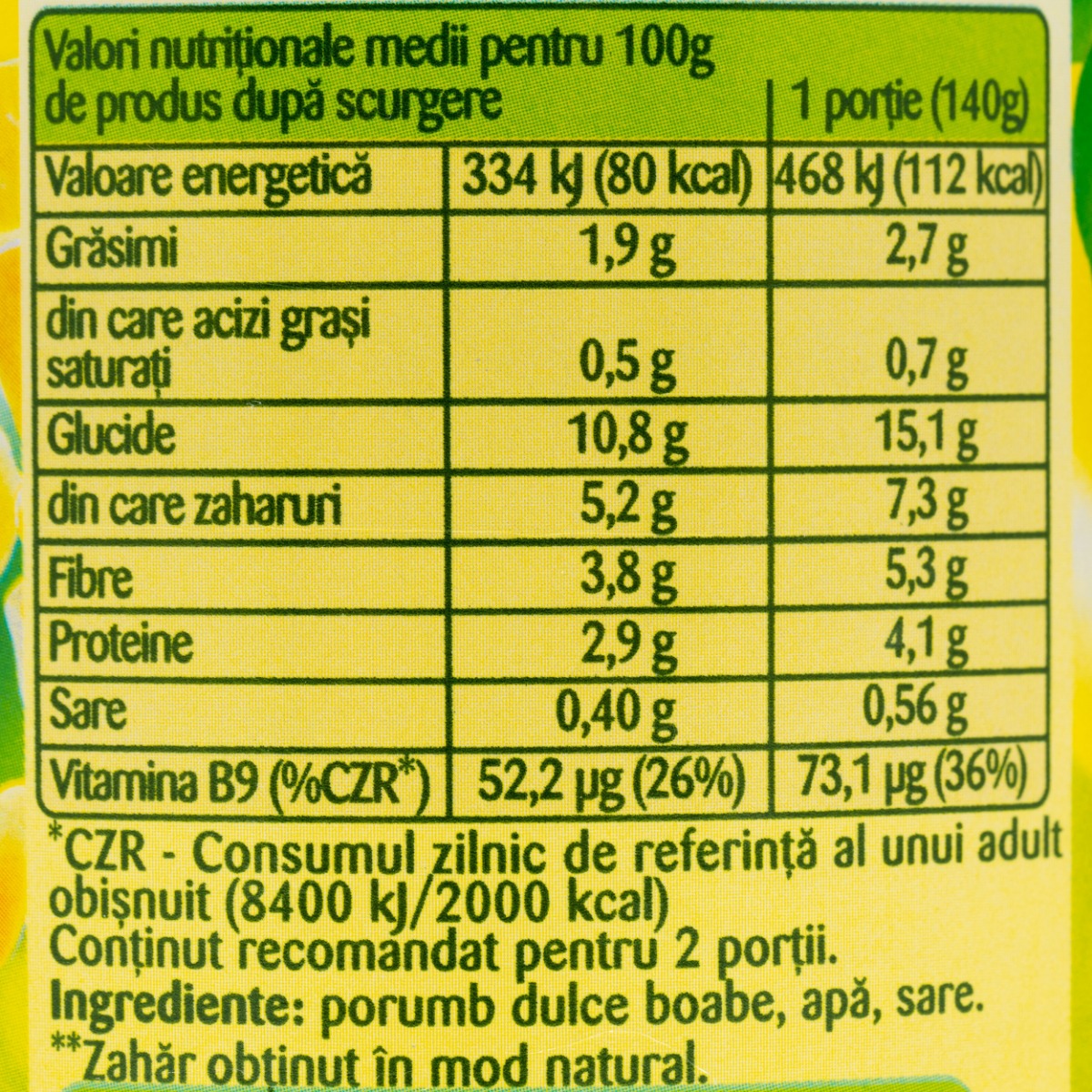 Ingrediente: Porumb dulce boabe, apa, sare.