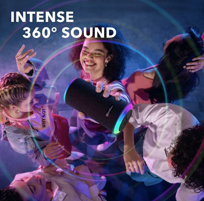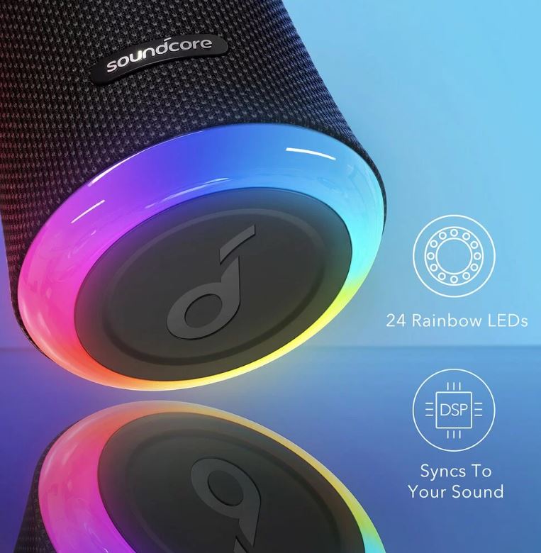 Luminile LED pulseaza si stralucesc pe ritmul muzicii, totul pentru o experienta audio-video complet imersiva cu boxa portabila Anker Soundcore Flare 2.