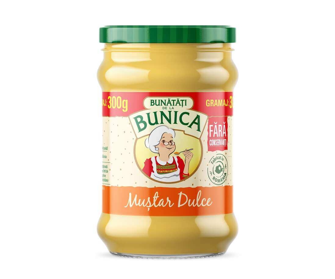 Ingrediente: Apa, boabe de mustar(15%), zahar, otet din vin, sare, condimente, colorant(beta caroten), agent de ingrosare(guma xantan).