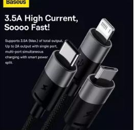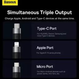 Cablu USB - Lightning / Micro / Type-C cu o lungime maxima de 1,20 m. Acceptaincarcarea cu un curent total de 3,5 A(2 A cand este conectat un dispozitiv) sitransmisie de date de 480 Mbs (doar pe conectorul Lightning).