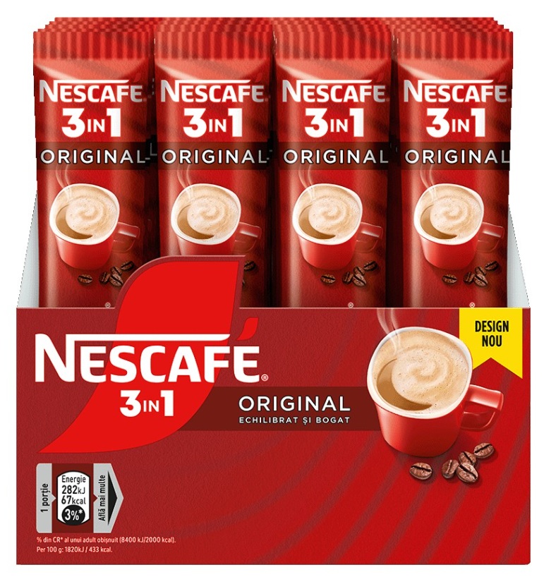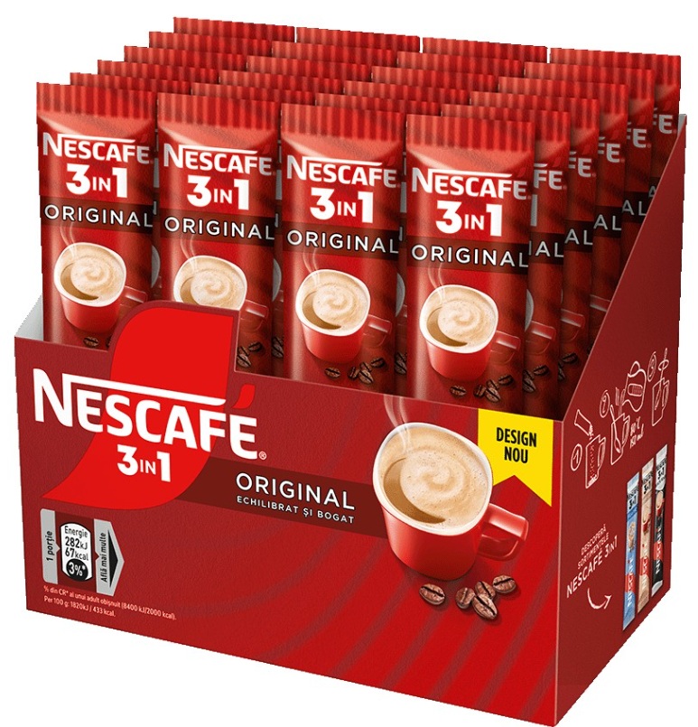 Nescafe 3in1 Original, combina cafeaua cu gust distinct Nescafe, cu o cantitate perfecta de zahar si gust de lapte, pentru o experienta a cafelei ideala, de fiecare data.