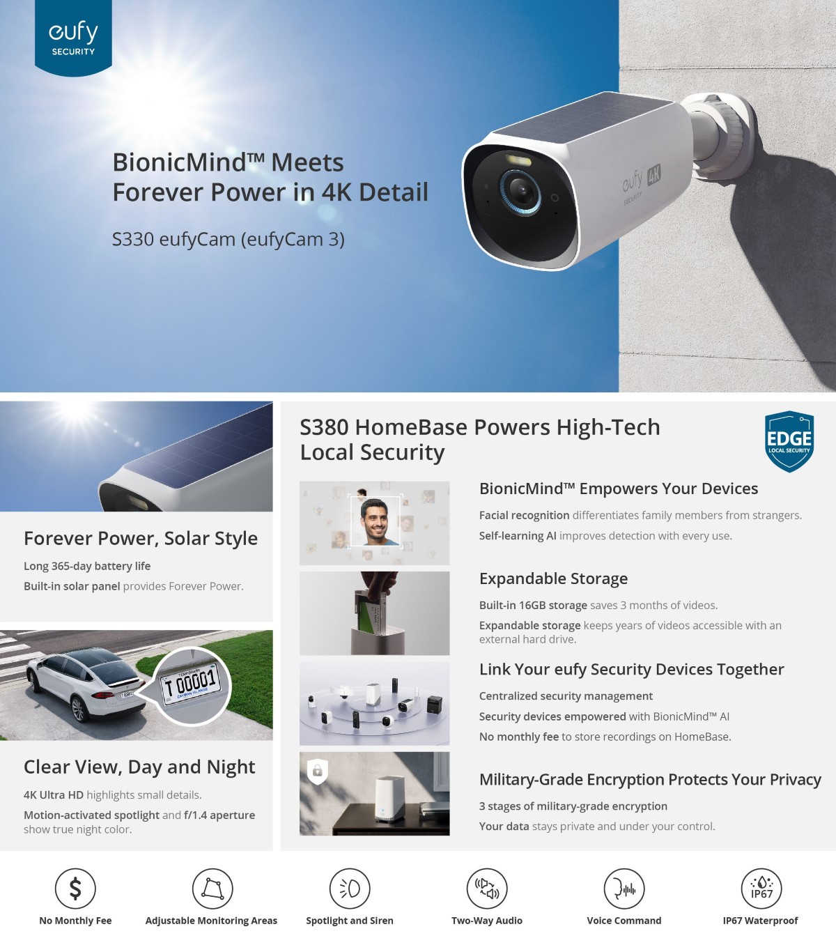 Camera Add-on eufycam 3 S330, 4K Ultra HD, Incarcare solara, BionicMind™, Nightvision