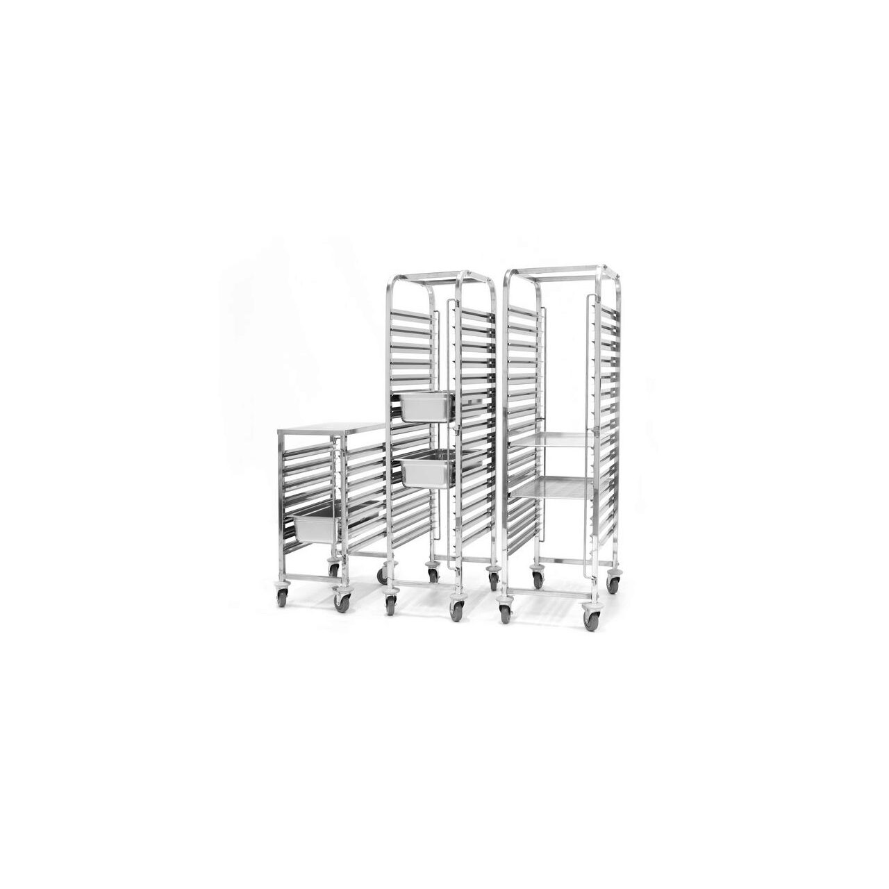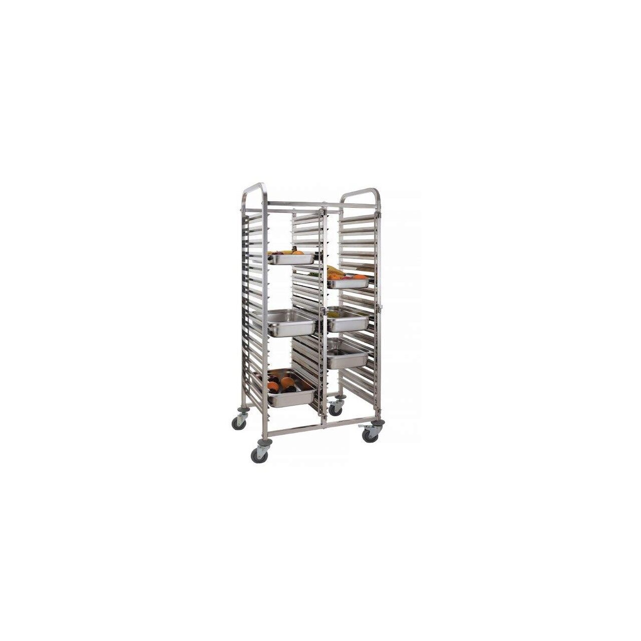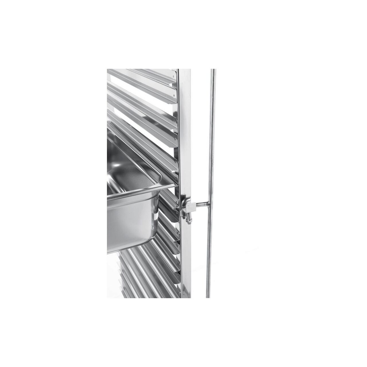 Un carucior pentru transportul containerelor GN, 30 de standuri, dimensiuni GN 1/1 si inaltime 1735 mm. Caruciorul este echipat cu protectie pe ambele capete impotriva caderii tavilor. Este perfect pentru gastronomie mare si mica, companii de catering, scoli si spitale.