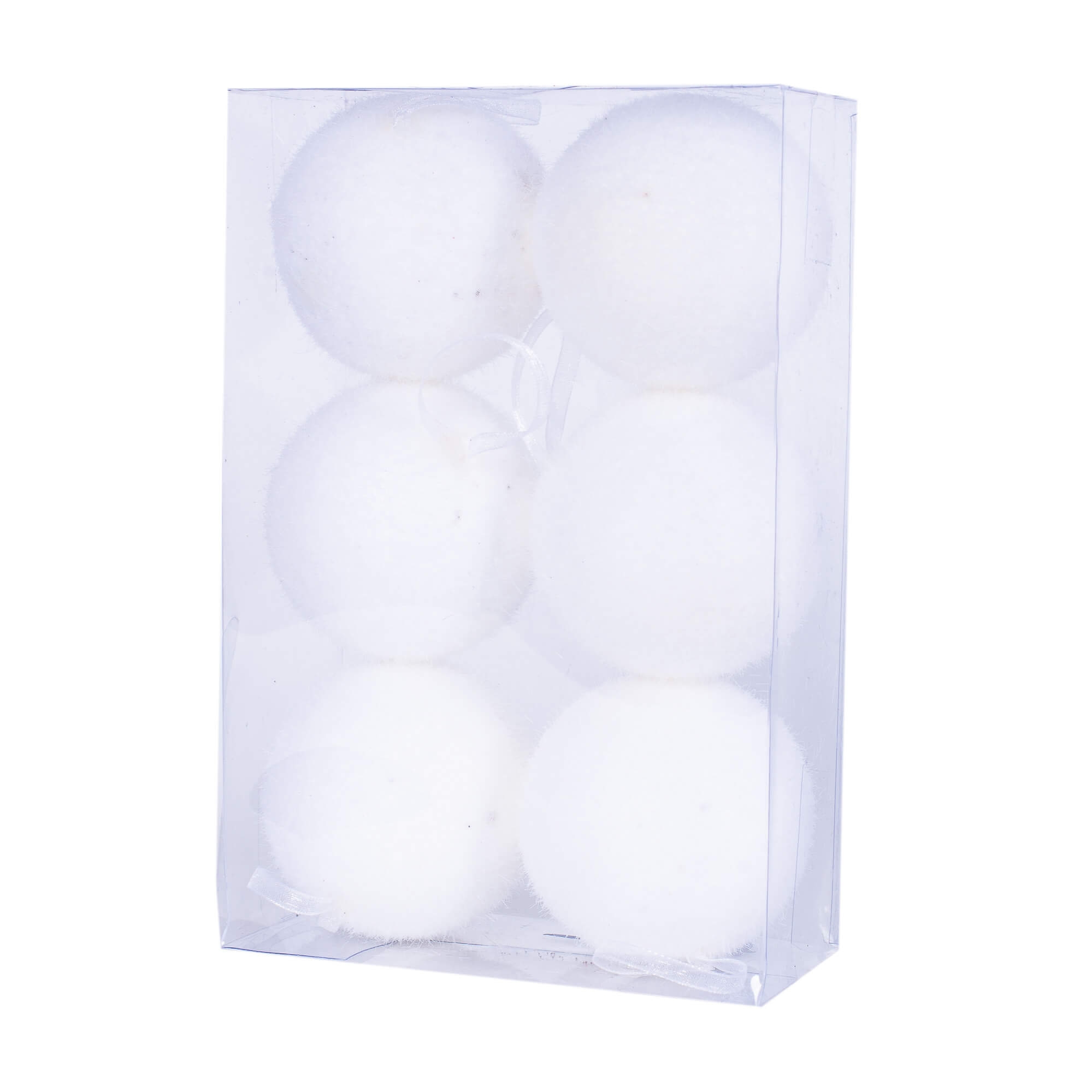 Setul contine 6 globuri, de culoarea alba, cu diametrul de 6 cm, ambalate intr-o cutie transparenta in forma dreptunghiulara. Acest mod de ambalare, pe langa faptul ca este foarte practic, ne duce cu gandul la magia sarbatorilor si la traditia de a primi si a oferi cadouri. Astfel, acest set de globuri poate fi oferit cadou unei persoane dragi, nemaifiind necesara ambalarea suplimentara sau poate infrumuseta bradul dumneavoastra de Craciun.