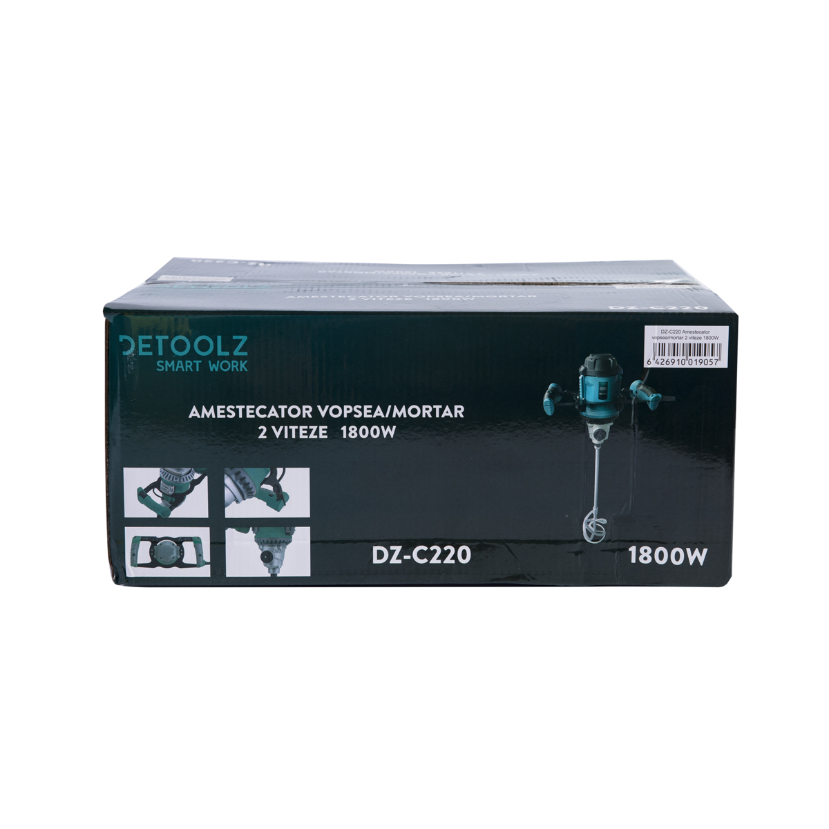 Amestecatorul de vopsea/mortar cu 2 game de viteze,1800W, Detoolz DZ-C220, este un produs robust, eficient si usor de utilizat pentru amestecarea materialelor de constructie lichide sau sub forma de pulbere, cum ar fi vopsele, mortar, adezivi, tencuieli si alte substante similare. Amestecatorul de vopsea/mortar cu 2 game de viteze,1800W, Detoolz DZ-C220 are urmatoarele caracteristici: • Design ergonomic pentru o manipulare usoara si un plus de confort; • Sistem de angrenare pentru utilizare intensa cu un cuplu mare si eficenta ridicata; • Viteza variabila controlata de un sitem de reglare a vitezei asigura o amestecare eficienta; • Inaltime de lucru reglabila cu pana la 10 cm, in functie de constitutia utilizatorului; • Ideal pentru mixarea de adezivi, mortar, vopsea, ipsos, umplutura tencuiala sau zidarie, acoperiri glet, etc.; • Cuplu puternic al utilajului permite utilizarea la amestecarea diferitelor tipuri de material; • Constructie robusta, din materiale de fabricatie de cea mai buna calitate, usoare si rezistente pentru o durata de viata extinsa. Continut colet: • Amestecator DZ-C220 • Manual de instructiuni • Paleta amestecare unica K3 Ø120mm • Tija conectare M14 • Cheie simpla si cheie imbus • Cheie hexagonala cu surubelnita • Un set perii carbon pentru motor • Cutie de transport din plasic tip BMCSpecificatii