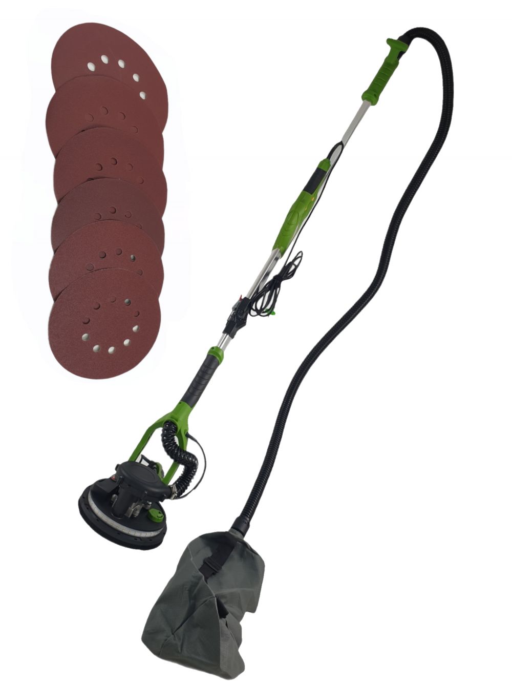- tija telecopica si pliabila cu extindere de la 140 cm la 170 cm ( s-a masurat inaltime din talpa pana la conectiunea furtunului). Tija telescopica se prelungeste cu inca 30 cm fata de valoarea nominala si poate fi blocata cu ajutorul surubului prevazut. Pentru a facilita transportul, masina de slefuit pereti (girafa) poate fi demontata la jumatate din lungimea ei de lucru.