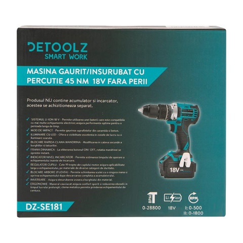 Masina de gaurit si insurubat cu percutie, 45Nm 18V fara perii, Detoolz DZ-SE181este o unealta universala pentru gaurire si percutie in caramida, beton sau lemn dar si pentru slabirea sau strangerea suruburilor.