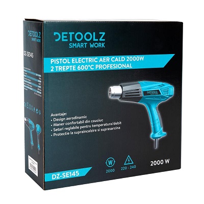 Pistolul electric cu aer cald 2000W, 2 trepte de temperaturi 450 ℃ / 600 ℃, Detoolz DZ-SE145 este un produs de uz gospodaresc, destinat pentru operatiile de desprindere a vopselei, imbinarii tevilor, contractarii PVC, imbinarii si indoirii obiectelor din plastic, precum si utilizarii pentru uscare si dezghetare in general.