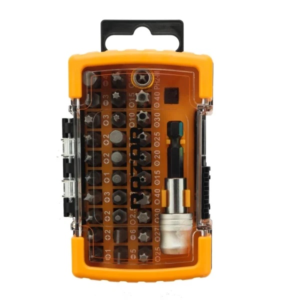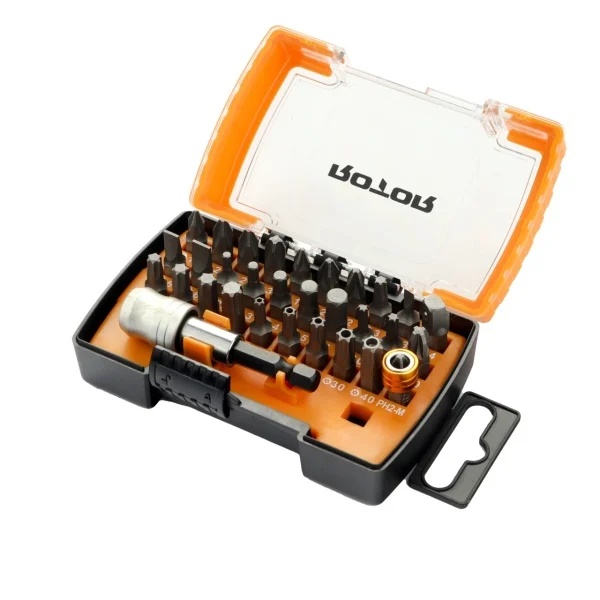 Setul RBB32 contine 32 de piese esentiale pentru lucrarile de insurubat si de impact. Acesta include biti de 25 mm din otel CRV6150, renumiti pentru durabilitatea si rezistenta lor, fiind ideali pentru utilizarea cu scule electrice sau manuale. Biti magnetici PH2 sunt inclusi in acest set, ceea ce permite o prindere mai buna a suruburilor, prevenind alunecarea. Setul mai include un adaptor pentru conectarea bitilor si un suport metalic pentru depozitarea si organizarea acestora.