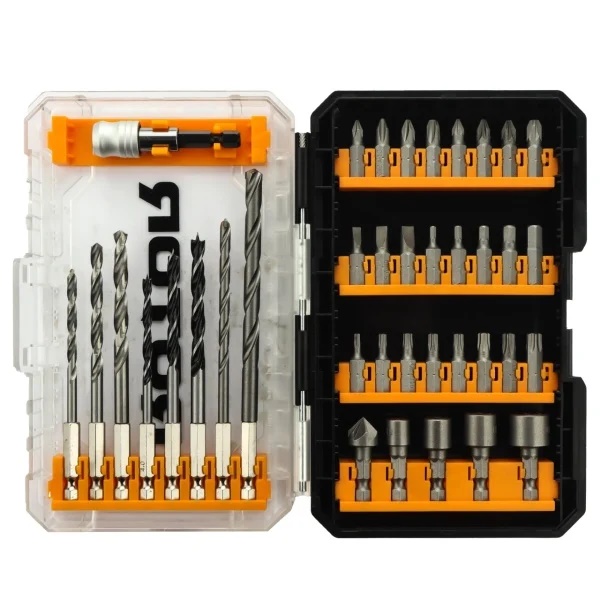 Setul RBB38 este ideal pentru diverse lucrari de reparatii, bricolaj sau constructii, avand o gama variata de unelte de calitate. Acesta contine 38 de piese, inclusiv biti hexagonali HSS pentru o taiere precisa si durabila, biti hexagonali speciali pentru lemn, precum si biti pentru zidarie. De asemenea, setul include biti din otel CRV6150 pentru surubelnita, chei tubulare din otel 50BV30 si o freza de zencuire pentru fineturi de inalta precizie. Toate piesele sunt insotite de un suport magnetic pentru depozitare si acces rapid.