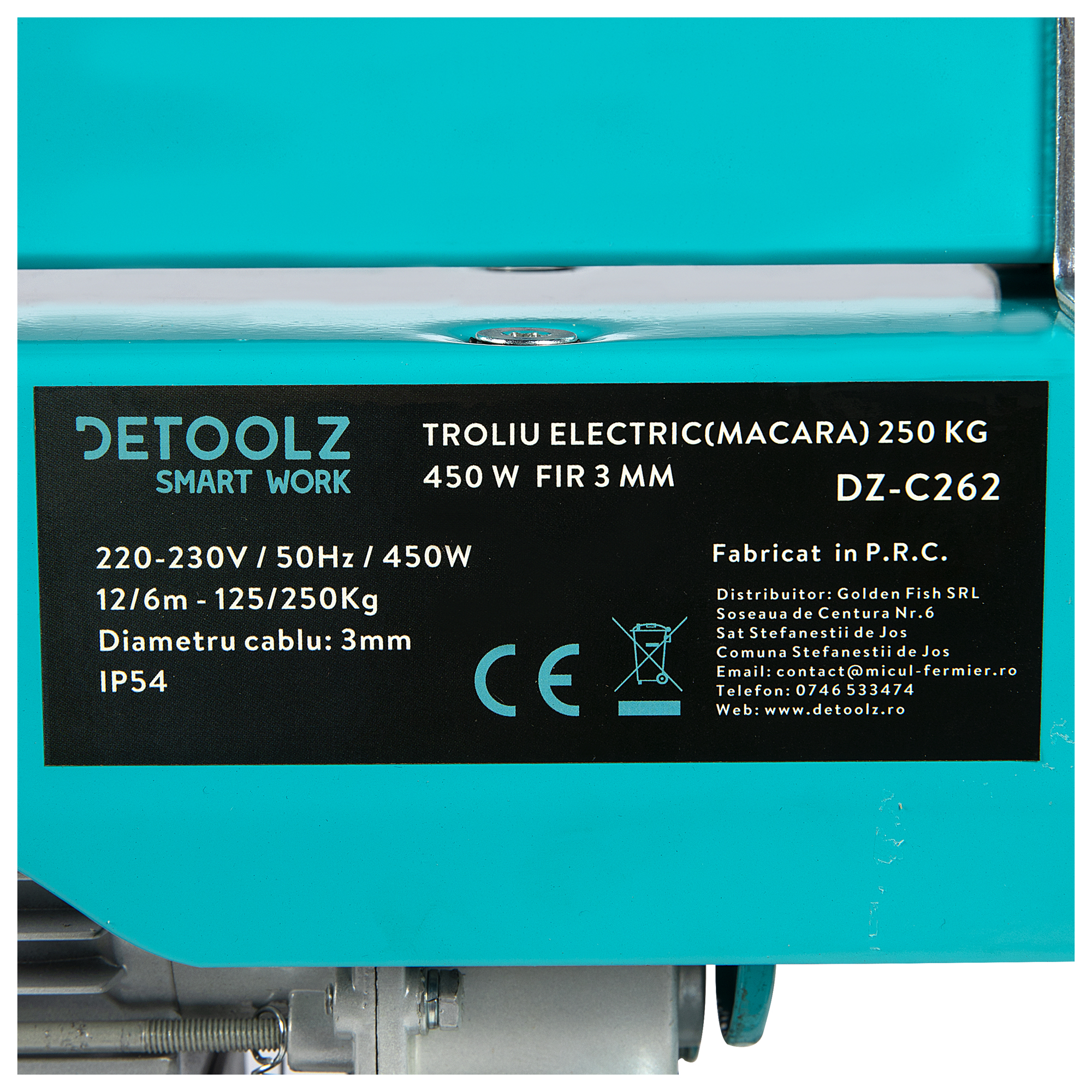 Caracteristici troliu electric (macara) 250kg, 450W, fir 3mm, Detoolz DZ-C262: