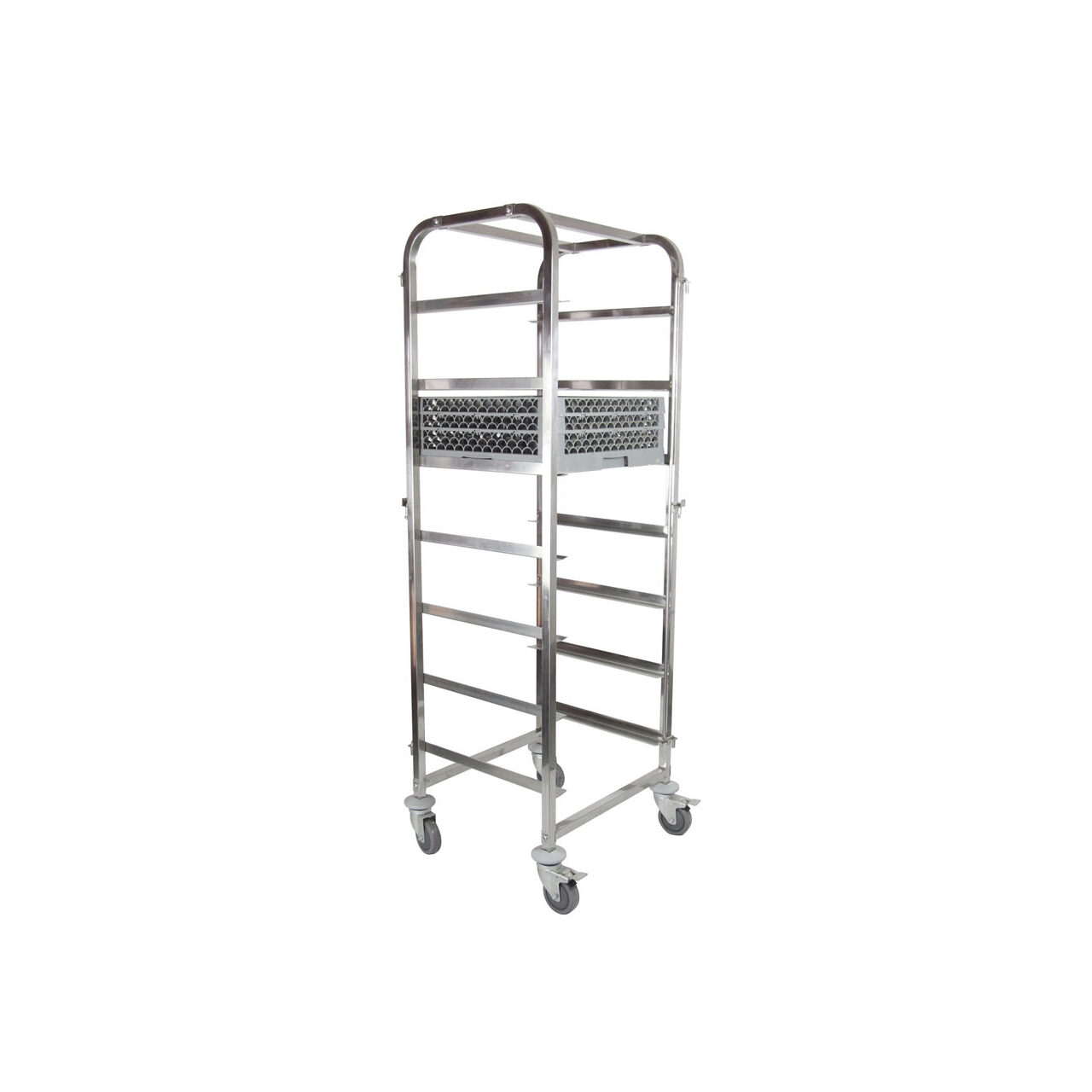 Carucior mobil pentru cosurile de spalat vase Hendi Inox 7x 500x500 mm – Pentru cosuri 500x500 mm cu 7 straturi, spatiul dintre acestea este de 200 mm – Blocaje tavi pe ambele parti. – Echipat cu patru role, dintre care doua au frane. – Livrare in ambalaj plat.Specificatii