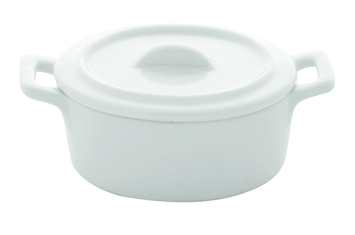 Caserola ovala cu capac din portelan alb 105x70x45mm, linia Finger FoodSpecificatii