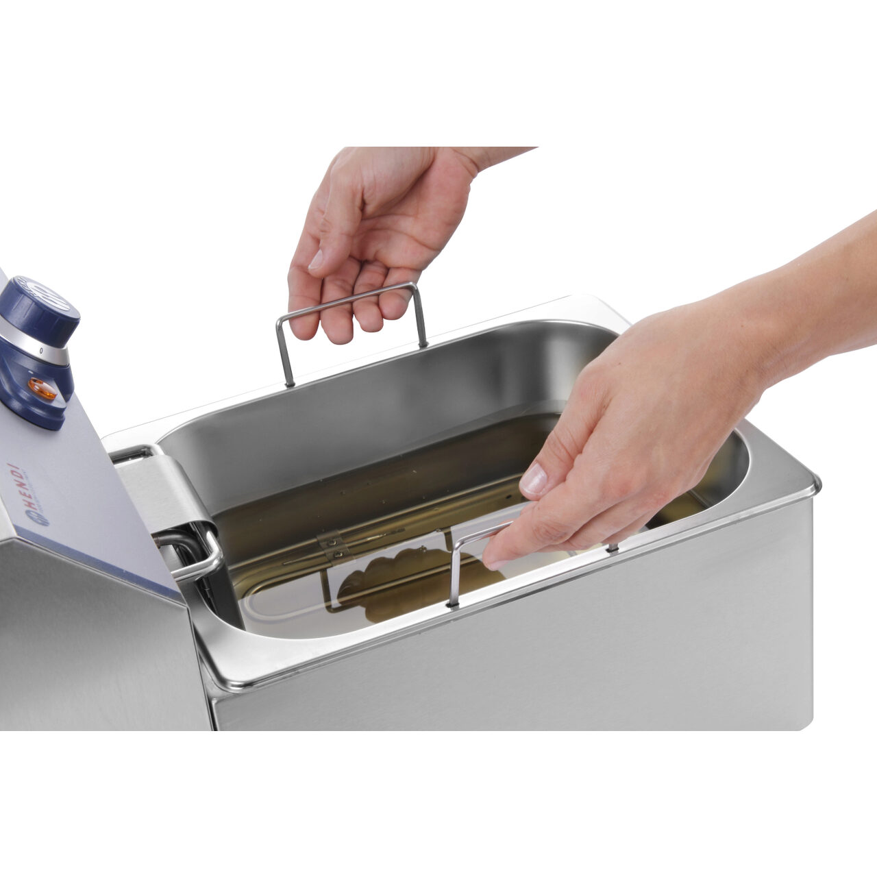 Friteuza electrica Hendi este realizata din inox, iar posibilitatea scoaterii recipientului pentru grasime faciliteaza curatarea completa a dispozitivului si a tuturor componentelor sale.
