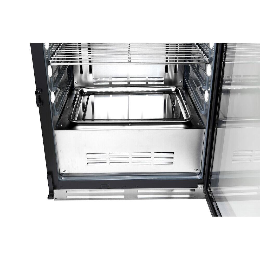 Corpul, cadrul usii si manerul sunt fabrocate din otel inoxidabil AISI 304. Usa fabricata din 2 straturi de sticla temperata colorata Low-E, care creste eficienta energetica prin blocarea luminii infrarosii, si a razelor UV din exterior, impiedicand in acelasi timp transferul de caldura in interior. Incuietoarea usii este inclusa. Recipient pentru apa distilata fabricat din ABS - apa distilata trebuie umpluta manual. Notificare pe afisaj si alarma sonora pentru a notifica atunci cand umiditatea este sub 15% pentru ca utilizatorul sa umple recipientul de apa. Alarma care indica faptul ca usa este deschisa mai mult de 3,5 minute - protectie impotriva perturbarii necontrolate a conditiilor din camera. Lampa de sterilizare UVC incorporata pentru a preveni dezvoltarea bacteriilor si pentru a garanta un mediu sigur pentru carne; atunci cand usa este deschisa in timpul procesului de condimentare, bacteriile nu au posibilitatea de a se dezovolta. Racire fortata prin intermediul unui ventilator care asigura nivelul necesar de circulatie a aerului. Lumini LED plasate pe ambele parti ale camerei si pe tavan. Sarcina maxima per carlig: 25 kg. Sarcina maxima a tijei de agatat: 50 kg. Intervalul de temperatura: 1 - 25 grade Celsius. Interval de umiditate reglabil: 60-85%. Nivelul actual de umiditate este afisat pe panou. Agent frigorific: R600a.