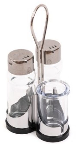 Set pentru sare/ piper/ scobitori, suport din inox, recipiente din sticla cu capace din inoxSpecificatii