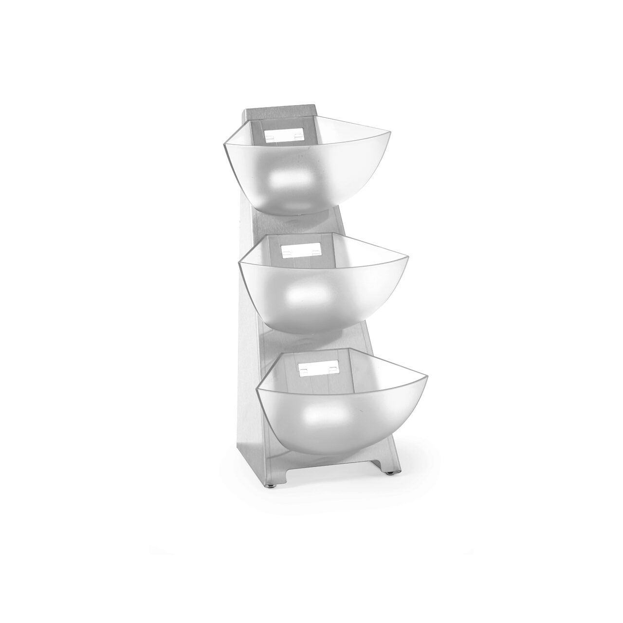 Suport pentru servire cu 3 compartimente pentru diverse condimente, pliculete, etc. Suport din otel inoxidabil cu 3 boluri din plastic de 1 lt fiecare. 190x240x(H)410 mmSpecificatii