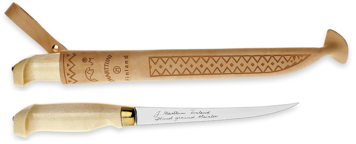 Cutit clasic de filetat. Lama este din otel inoxidabil cu varful progresiv, manerul din lemn de mesteacan, iar tocul din piele de ren.