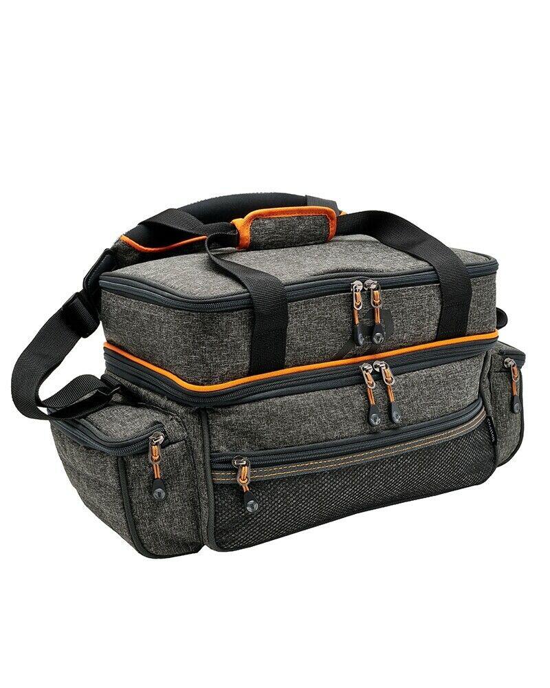 Geanta practica cu forma compacta fabricata pentru a transporta o multime de echipamete necesare unei partide de pescuit. Cu doua compartimente principale, pozitionate unul deasupra celuilalt. Compartimentul inferior ofera o capacitate de 25x38x15cm si un buzunar de tip plasa cu fermoar, in timp ce al doilea compartiment, cel superior dispune de cinci pereti despartitori detasabili pentru a presonaliza dupa bunul plac spatiul.