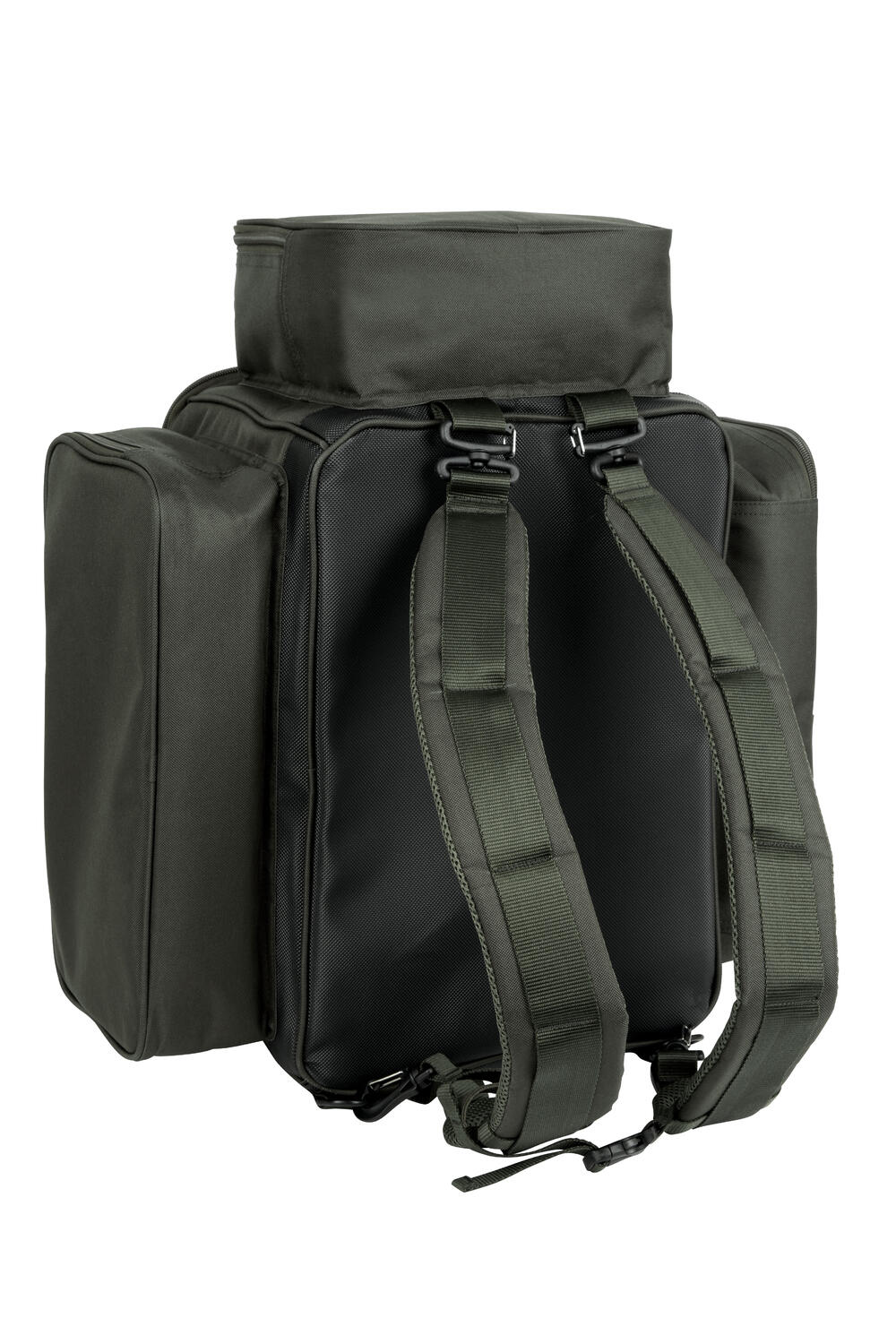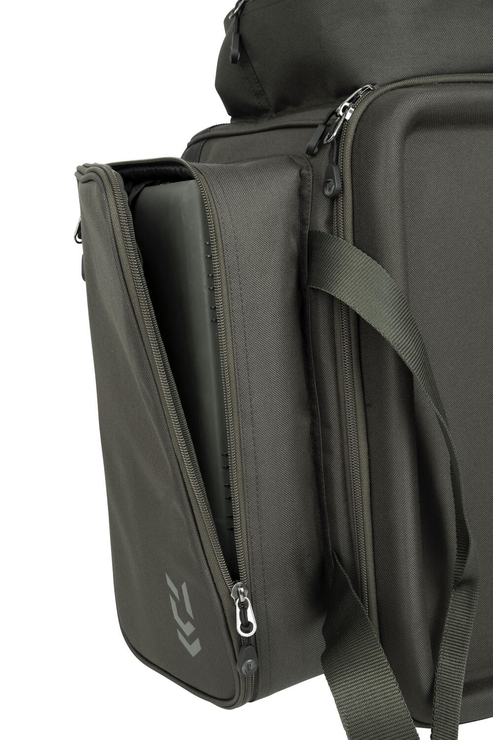 Inchiderea compartimentului principal este ermetica, datorita fermoarelor rezistente la apa si manipulari repetate. Acoperirea din PVC este durabila si rezistenta la apa sau murdarie. Rucsacul este echipat cu trei buzunare exterioare plasate astfel: doua buzunare laterale mai lungi si un singur buzunar superior mai mic (potrivite pentru depozitarea cutiilor, pungi PVA, buzz bari, etc). Compartimentul principal este proiectat pentru a pastra patru genti de accesorii din gama IS (Infinity System), sau doua genti cool de dimensiuni mai mari, oferind un sistem de depozitare complet si flexibil.