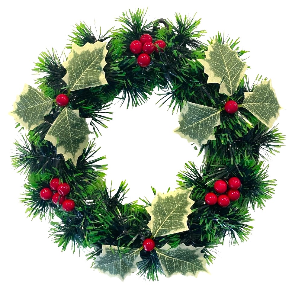- Coronita, realizata din beteala uniform asezata pe suportul din plastic, este frumos decorata cu ornemente sub forma de fructe de padure rosii si frunze de ilex. Ornamentele de pe coronita adauga un strop de culoare si stralucire, completand perfect decorul magic al Craciunului.