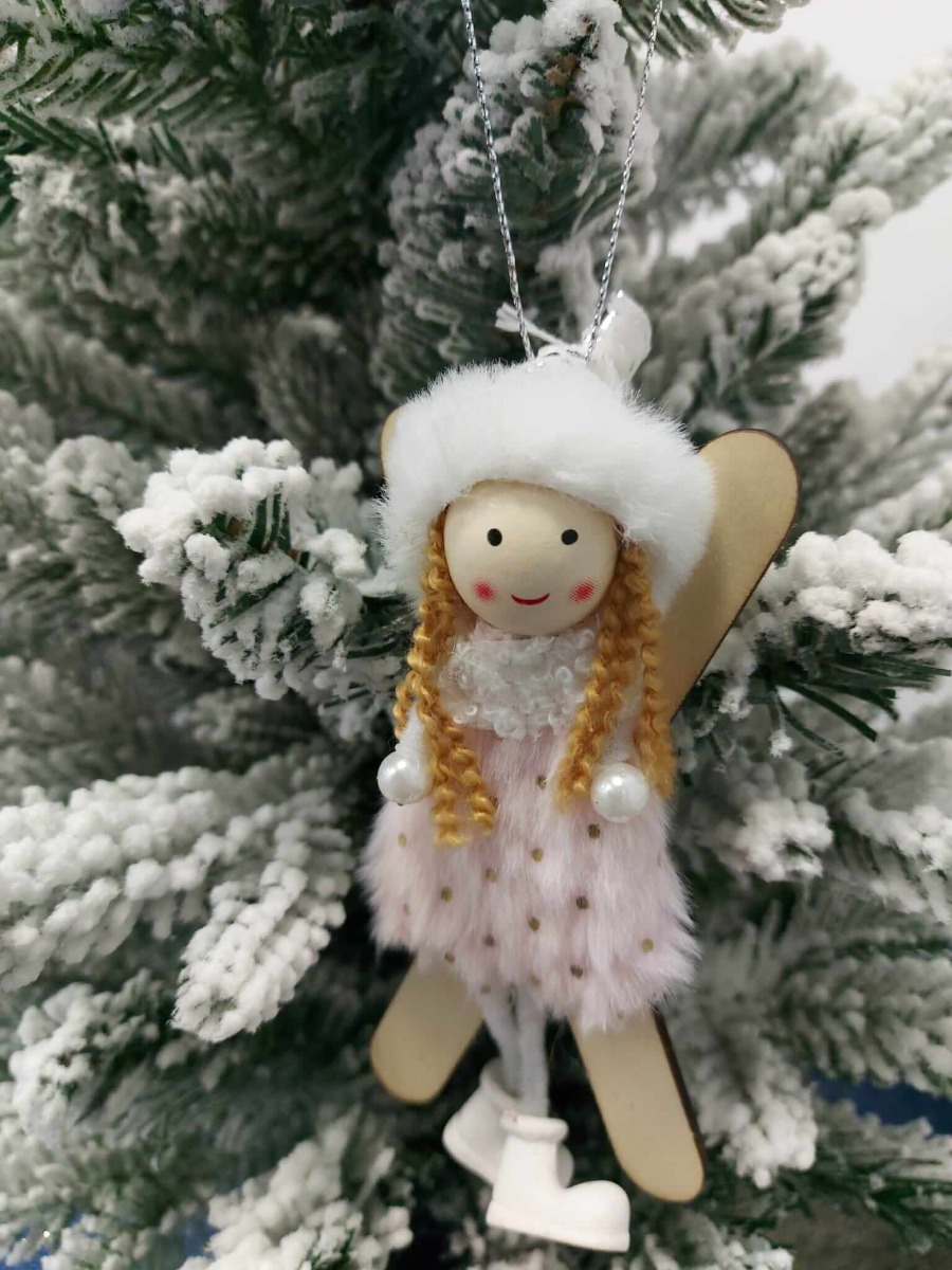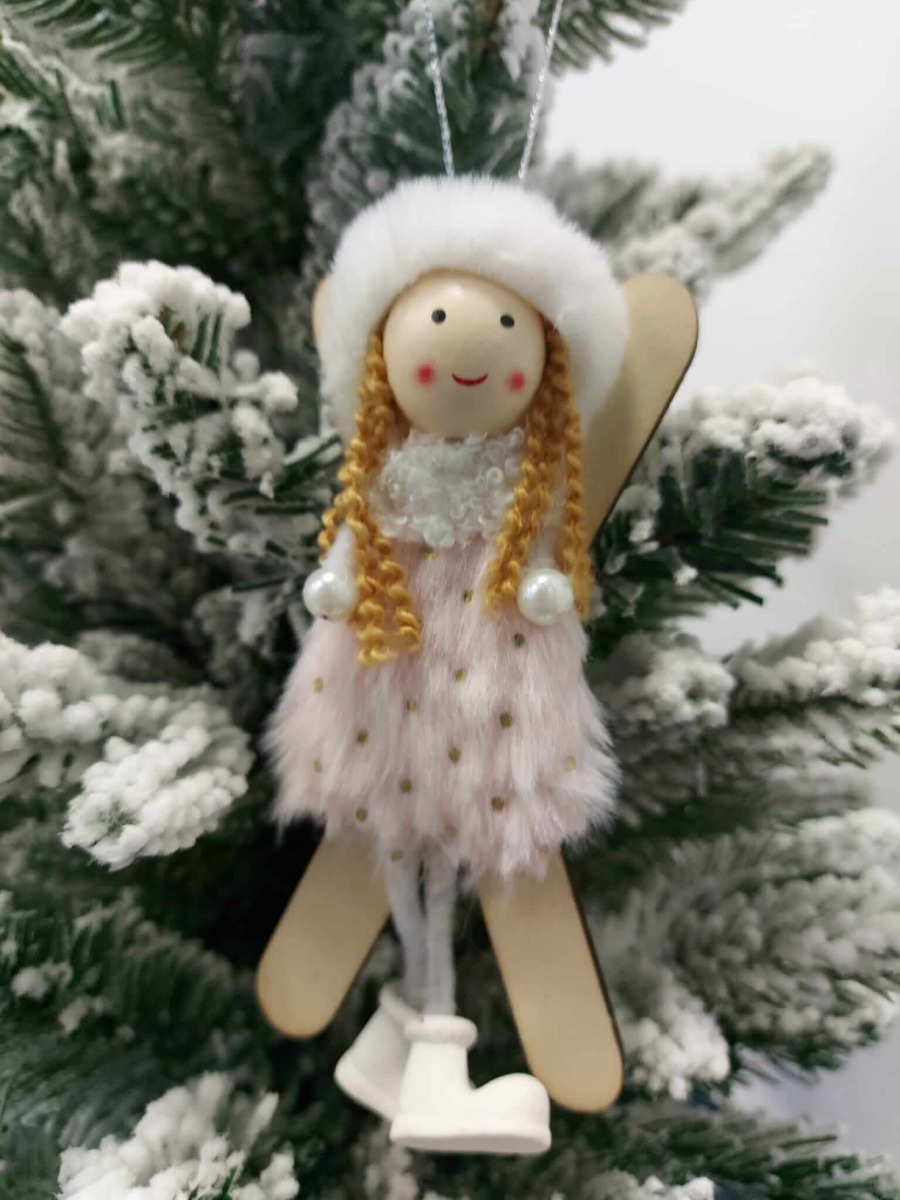 Figurina de agatat, copii cu schiuri alb-roz Xmas