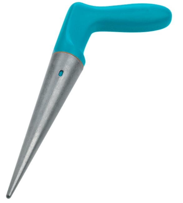 Plantatorul conic GARDENA este optim pentru plantarea fără efort a răsadurilor. Vârful metalic solid şi rezistent la rugină, din zinc turnat sub presiune pătrunde la o adâncime de 19,5 cm în sol şi formează un orificiu pentru plantă. Mânerul ergonomic se potriveşte bine în mână şi facilitează munca. Perioada de garanţie este de 25 de ani.