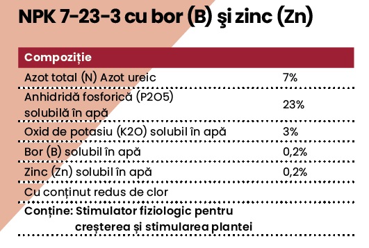 Azot ureic (N) - 7%, Anhidridă fosforică (P2O5) solubilă în apă - 23%, Oxid de potasiu (K2O) solubil în apă - 3%, Bor (B)solubil în apă - 0,2%; Zinc (Zn) solubil în apă - 0,2%; Conține stimulator fiziologic pentru creșterea și stimularea plantei