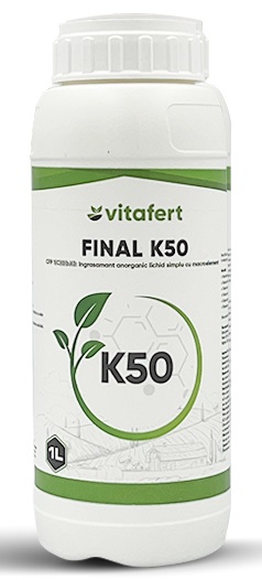 Final K50 este un ingrasamant lichid dens pe baza de potasiu pentru aplicare foliara si radiculara, acesta furnizeaza potasiu suplimentar pentru o gama larga de culturi.