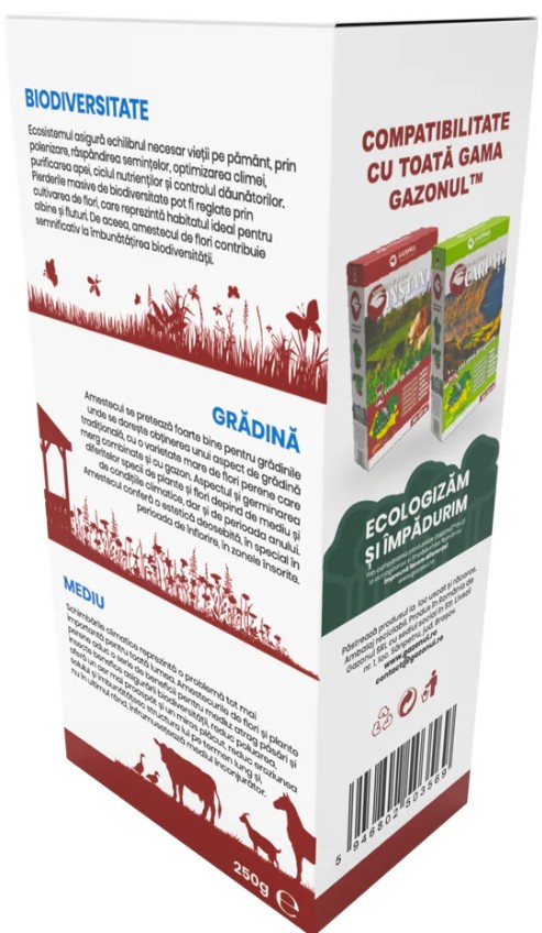 Gazonul™ Flori Pitice este un amestec de semințe,atent selecționat care aduce un plus de culoare și diversitate grădinilor, în timp ce contribuie activ la îmbunătățirea ecosistemului. Acest mix de plante joase creează un habitat ideal pentru polenizatori precum albinele și fluturii, sprijinind biodiversitatea și sănătatea mediului.