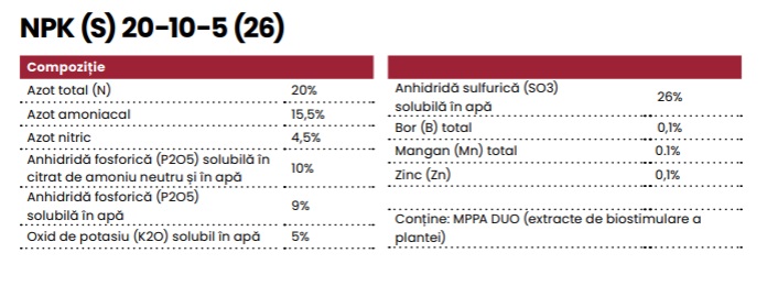 humici și aminoacizi cu efect de biostimulare, având ca principal efect stimularea creșterii intense a plantelor, mobilizarea și protejarea nutrienților din fertilizant împotriva retrogradării ireversibile în sol și dezvoltarea sistemului radicular.