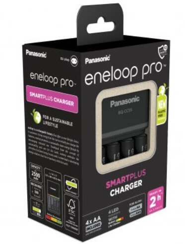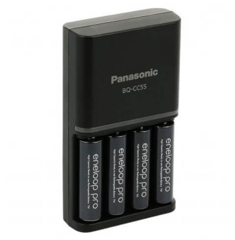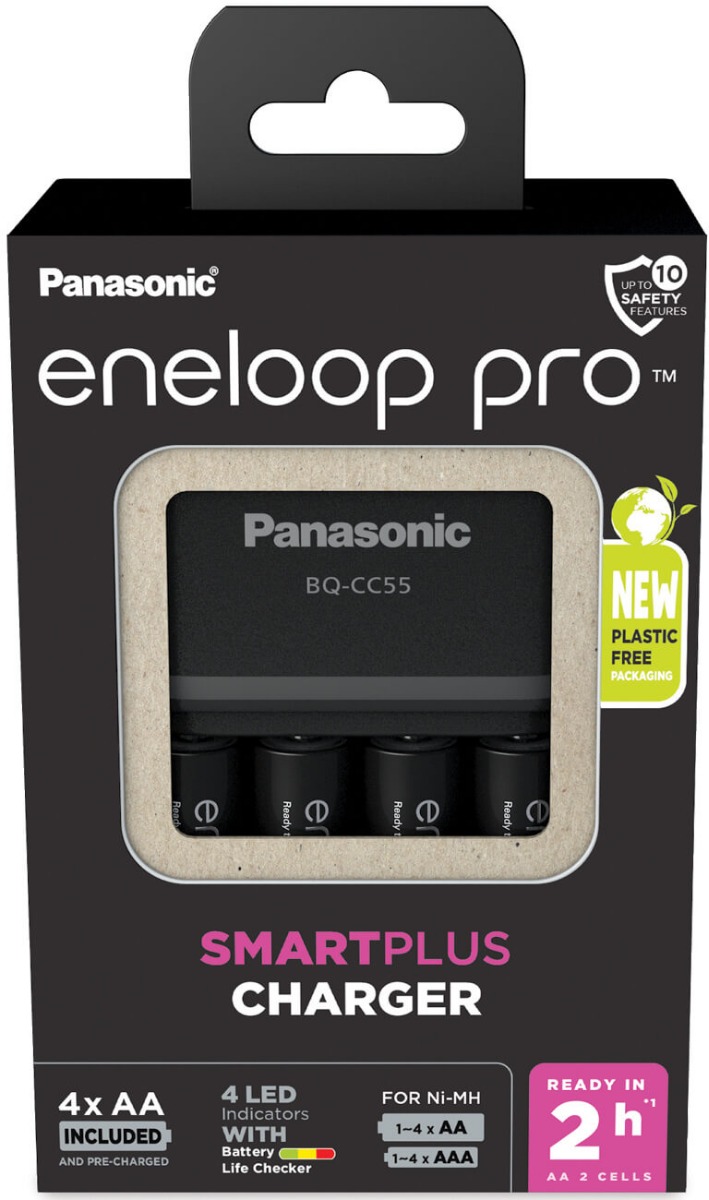 Incarcator BQ-CC55 Smart & Quick pentru acumulatori AA / AAA, marca Eneloop. Compatibil cu orice acumulator AA / AAA Ni-MH. Indicatori LED multicolor pentru statusul acumulatorilor: incarcat <20% / incarcat intre 20-80% / incarcat 80-100% Timp de incarcare de 1.5 ore (bazat pe incarcarea a 2 acumulatori Ni-MH AA de 2000 mAh). Poate incarca individual un singur canal, sau simultan 2, 3, 4 canale. Autodecuplare inteligenta. Tehnologie Minus Delta V Cut-off - Dupa ce alimentarea este finalizata, curentul scade pentru a proteja acumulatorul, pana la extractie. Ambalaj ecologic din carton reciclat. 0 plastic folosit. Acest model include 4x acumulatori Ni-MH AA Eneloop Pro 2500mAh.Specificatii