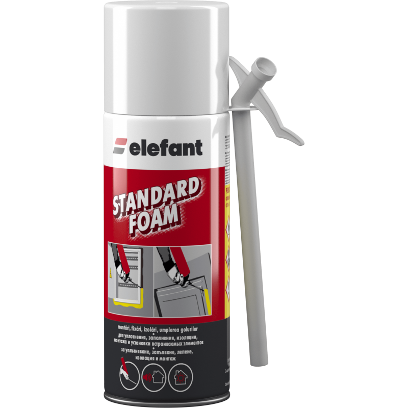 Spuma poliuretanica Elephant STANDARD FOAM pentru asezarea manuala. Se foloseste in constructii pentru montarea tocurilor de usi si ferestre, etansari, prindere, izolare, umplerea golurilor.