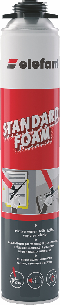 Spuma poliuretanica Elephant STANDARD FOAM pentru asezarea manuala. Se foloseste in constructii pentru montarea tocurilor de usi si ferestre, etansari, prindere, izolare, umplerea golurilor.