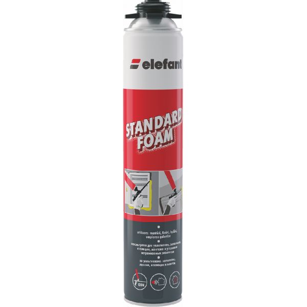 Elefant STANDARD FOAM spuma poliuretanica se utilizeaza in constructii pentru montarea ramelor de usi si ferestre etansari fixari izolari umpleri de goluri avand aderenta excelenta la majoritatea materialelor de constructii: lemn Aluminiu PVC otel beton caramida marmura etc. Nu adera la silicon PTFE polietilena. Se intareste in reactie cu umiditatea din aer si dupa intarirea definitiva (15 ore) isi mareste volumul cu 30-50%.