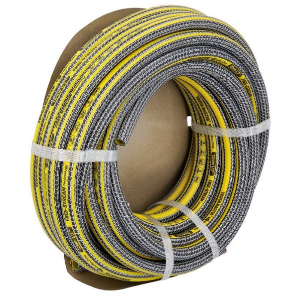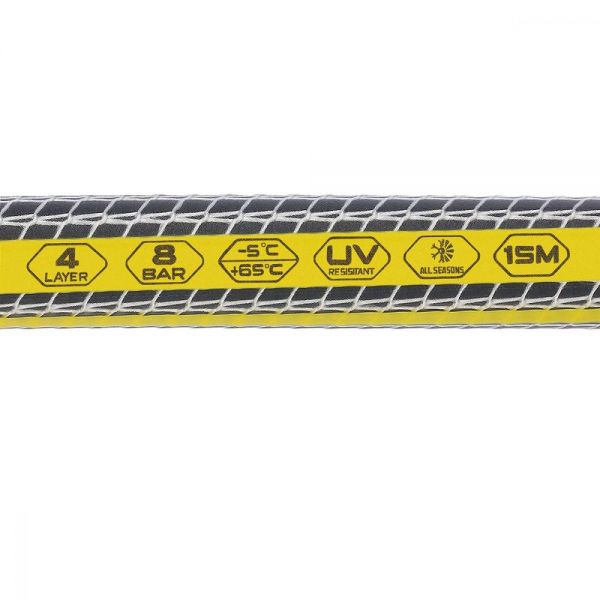 Constructia cu patru straturi (strat interior strat de cauciuc negru strat de armare cu fibre strat exterior transparent) realizata din material de cea mai inalta calitate asigura o flexibilitate si durabilitate ridicate. Intarirea din fire durabile pentru presiune inalta mentine structura furtunului asigurand trecerea neintrerupta a apei catre gradina dvs.