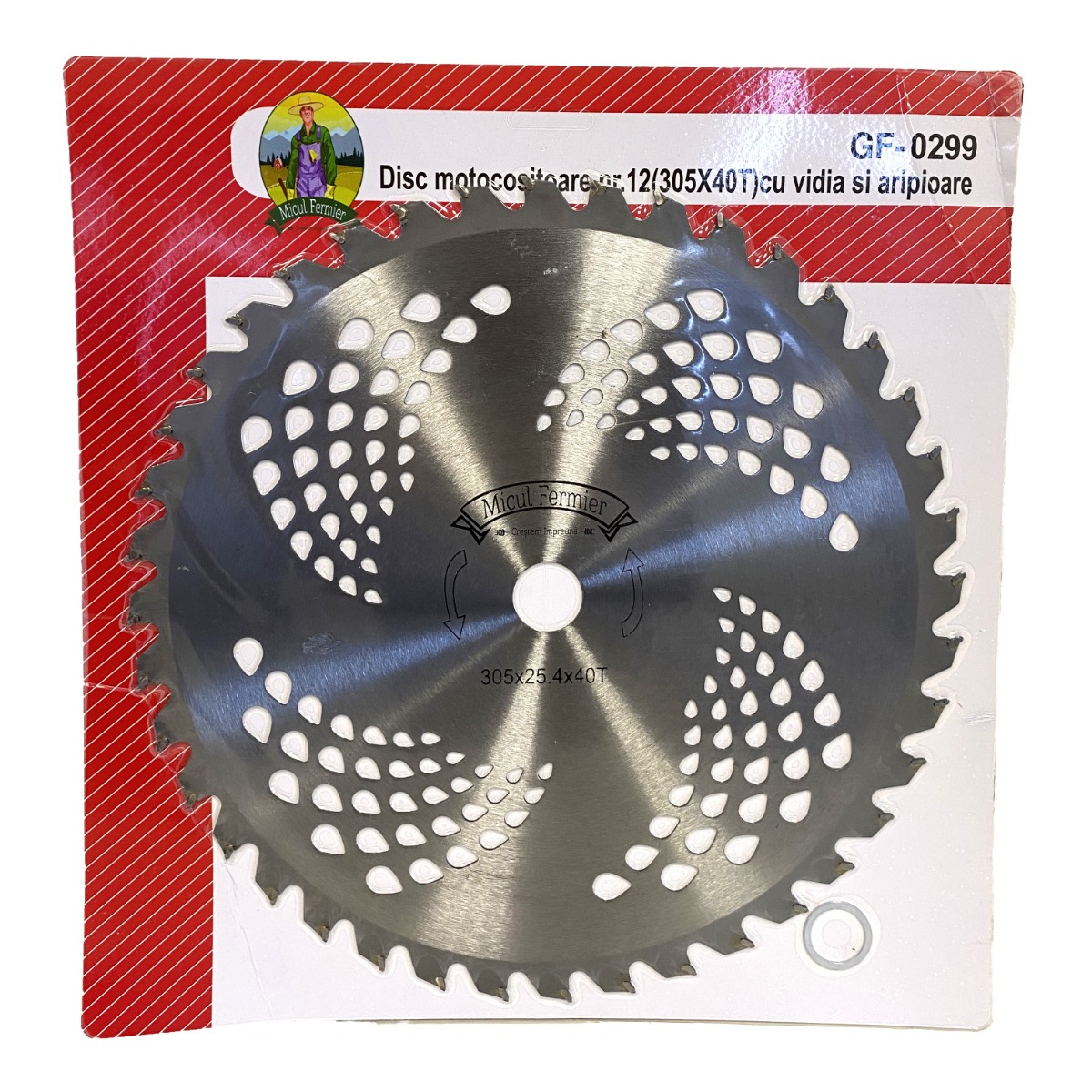 Discul pentru motocositoare numarul 12/300 cu vidia Micul Fermier GF-0299, 40 de dinti este un disc circular cu 40 de dinti vidia pentru iarba, arbusti si tufisuri cu diametru 300 mm si interior de 25,4 mm.