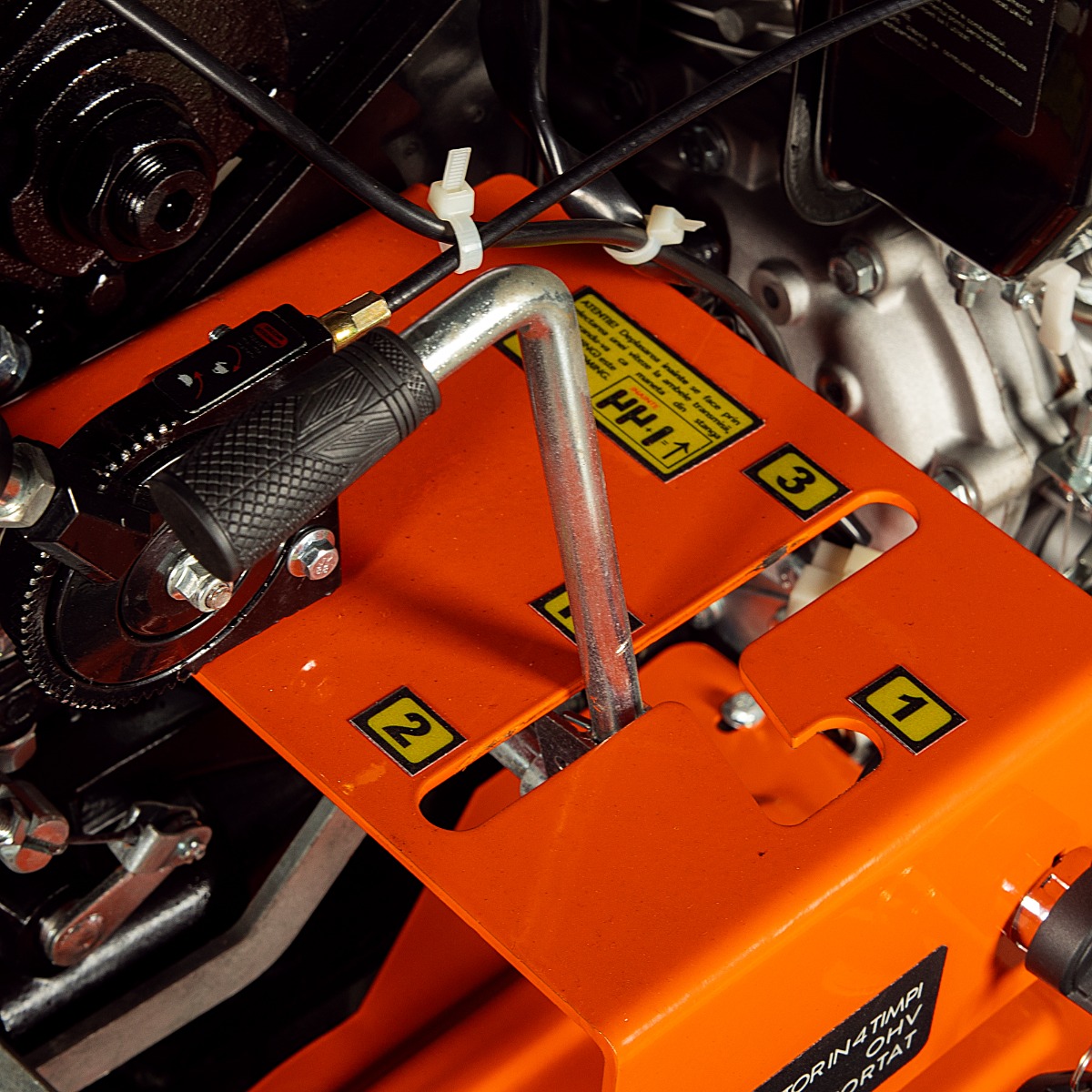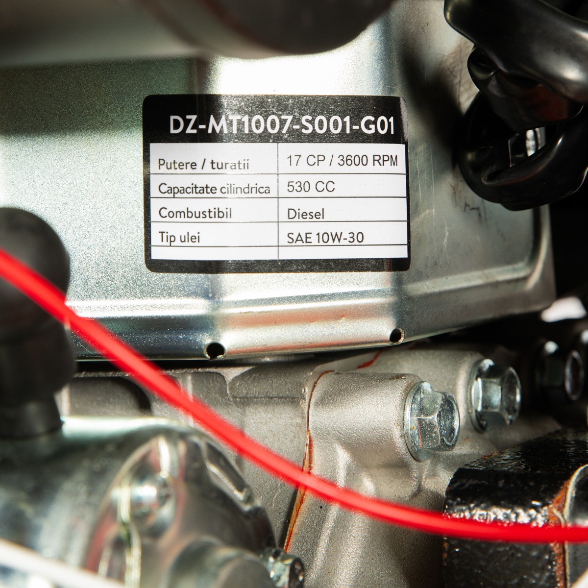 Mini tractor Micul Fermier, motorina, 17CP, 530CC, 4T cu 4 viteze si pornire electrica model DZ-MT1007-S001-G01 are dimensiuni reduse, este usor, multifunctional si foarte eficient in procesul de pregatire a solului pentru cultivare. Este echipat cu un motor in 4 timpi, monocilindru, OHV racit cu aer fortat, cu o capacitate cilindrica de 530 CC, dezvoltand o putere de 17CP si aprindere prin compresie MAC/Diesel. Mini tractorul are capacitatea de a lucra in zonele muntoase sau deluroase cu panta usoara, zonele usor inundate din campurile de orez, in livezi, gradini de zarzavaturi si sere sau pe alte terenuri accidentate. Poate urca dealuri (panta usoara), poate functiona in apa (putin adanca), poate merge pe un teren accidentat, se misca liber si schimba usor directia printr-un mecanism articulat.