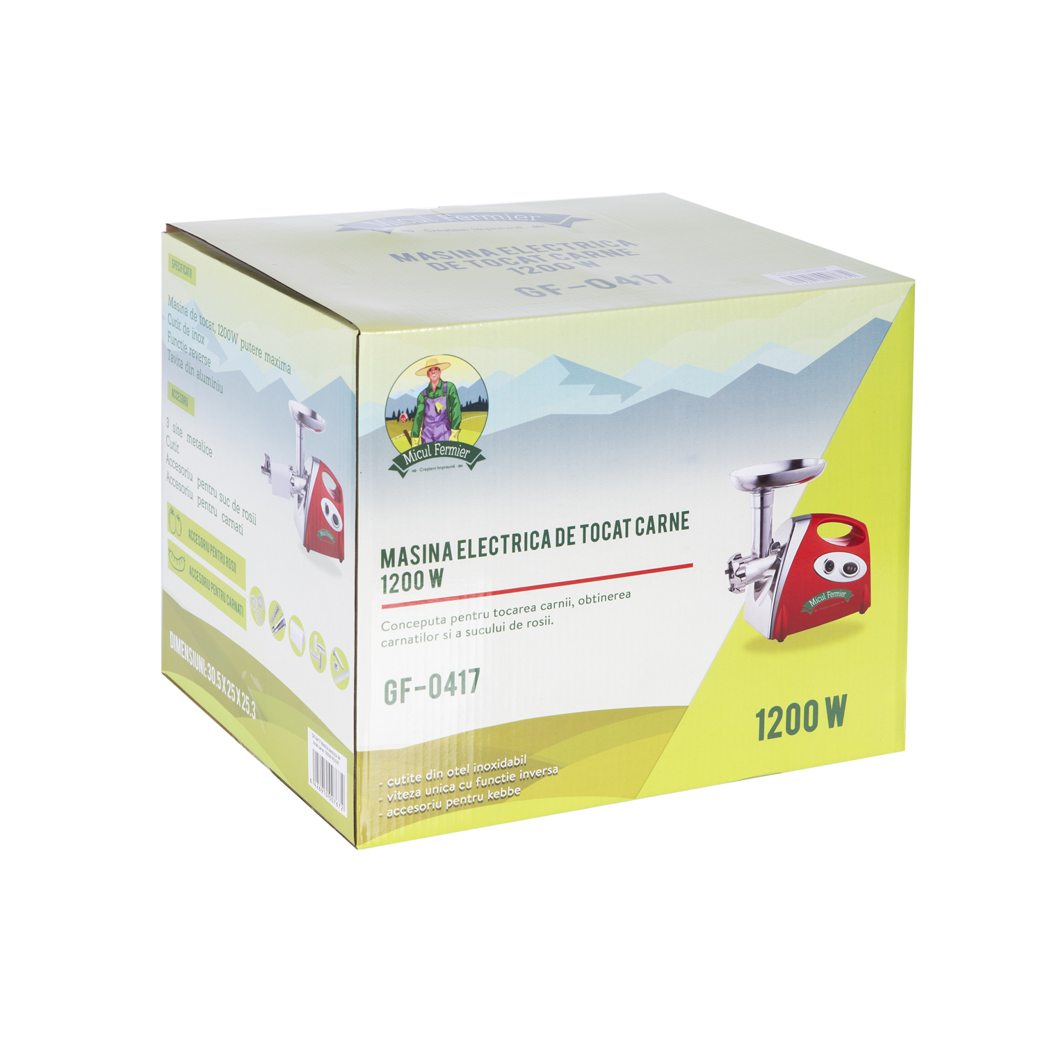 Masina electrica tocat carne rosie MGB-080, 1200W, Micul Fermier GF-0417 se livreaza ambalata individual si in numar de 4 buc pentru box-carton; greutatea este de 3.15 kg per buc.