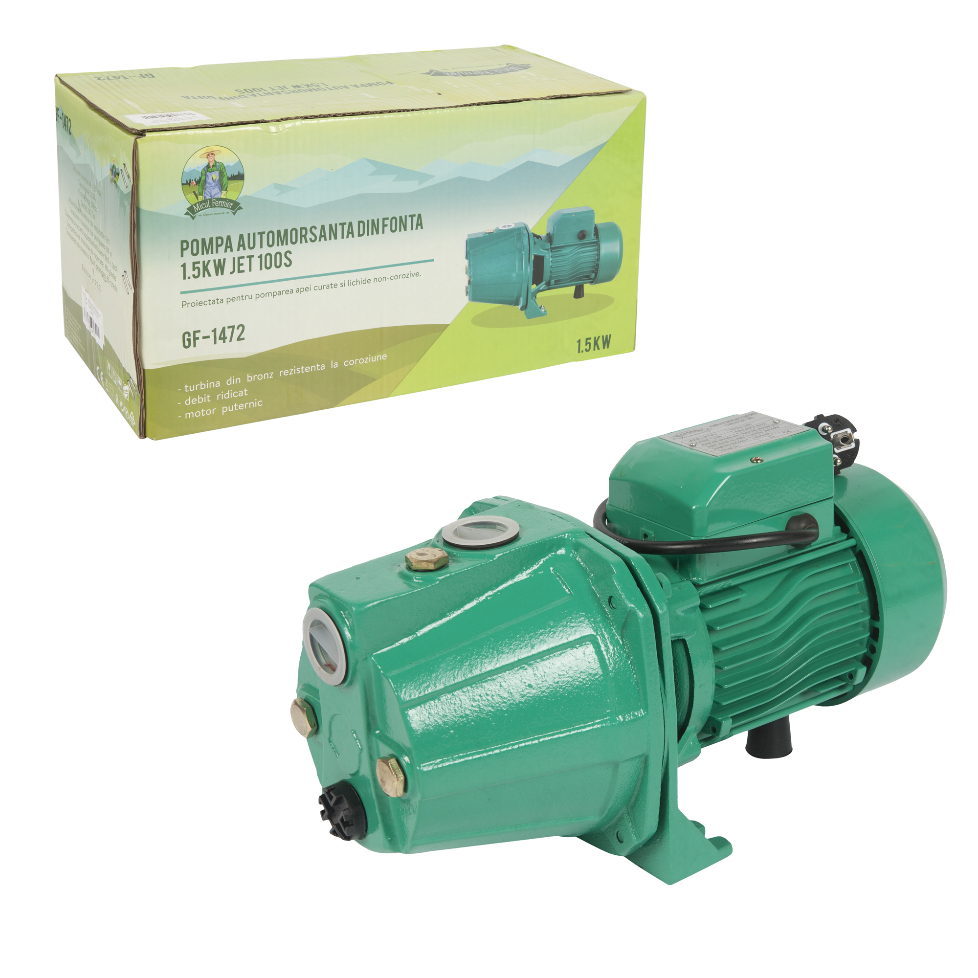 Pompa de apa autoamorsanta, JET100S este proiectata pentru pomparea apei curate si lichide non-corozive. Avantajele majore ale acestei pompe sunt fiabilitate, capul de descărcare mare, cap aspirare mare si timpul de auto-amorsare destul de scurt. Prin urmare,este utilizata pe scara larga pentru irigatii gradina, terenuri agricole, alimentare cu apă la clădiri înalte, pepiniere de flori, nave etc. Pompa apa de suprafata centrifugala autoamorsanta are o putere 1.5 kw. Turbina este din bronz rezistent la coroziune. Axul si corpul pompei sunt din inox.