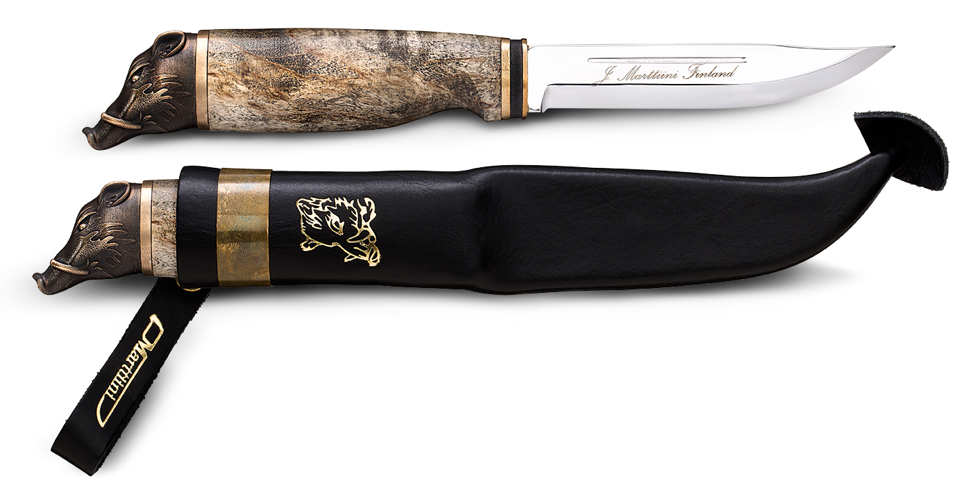 Cea mai recenta adaugare a cutitelor de transat carne Marttiini este cutitul Wild Boar.Manerul cutitului este finisat cu cap de porc mistret din bronz. Manerul curbat de mesteacan este colorat pentru a rezista la utilizare si pentru a asigura o buna aderenta. Lama este realizata din otel inoxidabil durabil.
