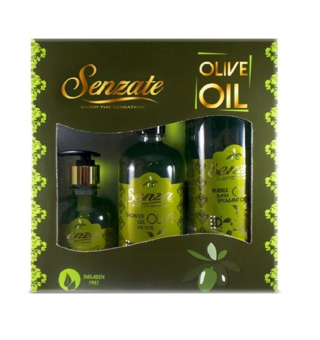 Senzate caseta Olive Oil contine un spumant de baie 1000 ml, un gel de dus 500 ml si sapun lichid 300 ml. Ingrijeste pielea oferind o senzatie placuta datorita extractului de ulei de masline, bogat in vitamina E, combate deshidratarea, este antioxidant si previne aparitia ridurilor.